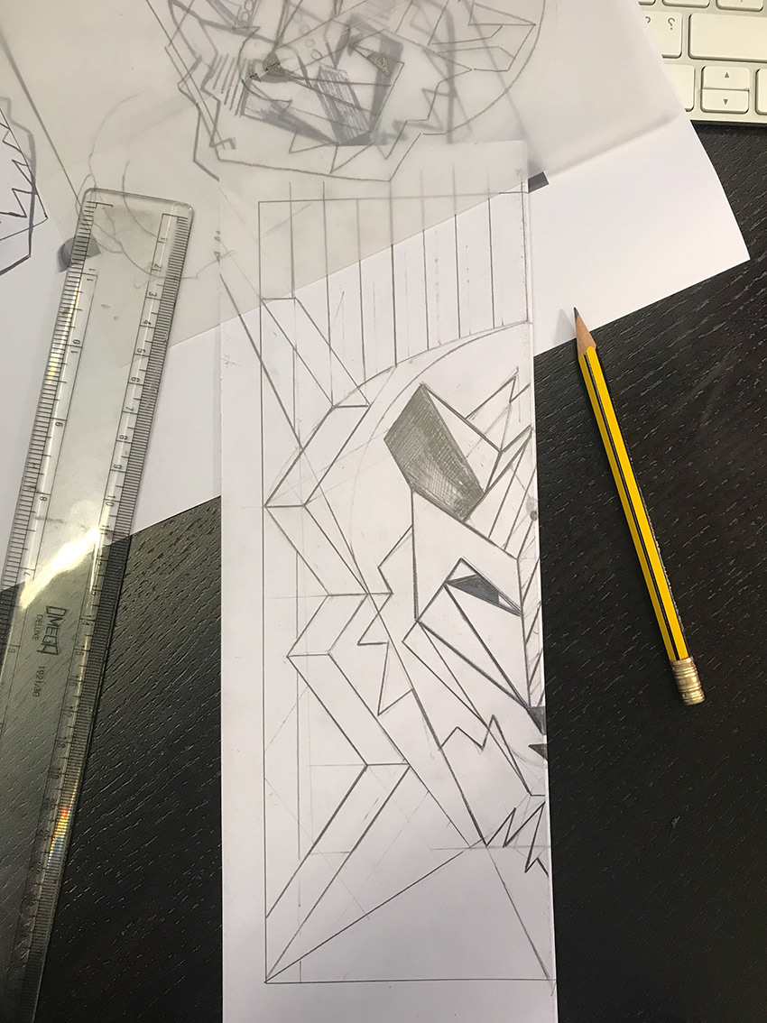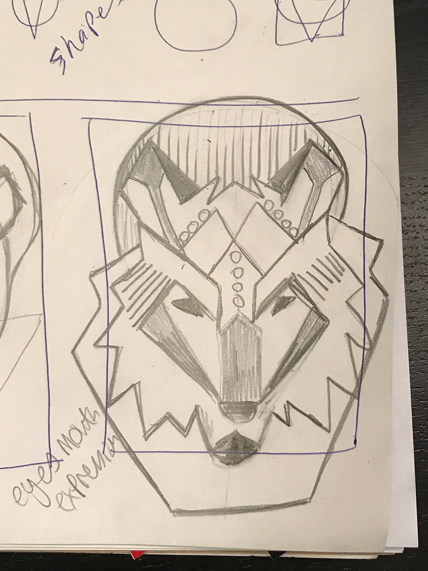 I started with a thumbnail quick sketch of the basic elements that I had collected form photos and research. After that drew it out half an A4 paper and reflected it on illustrator. I went for a very symmetrical frontal view as suggested by DKNG Studios. I used very geometrical shapes trying to avoid curves which I think suited the Wolf image.