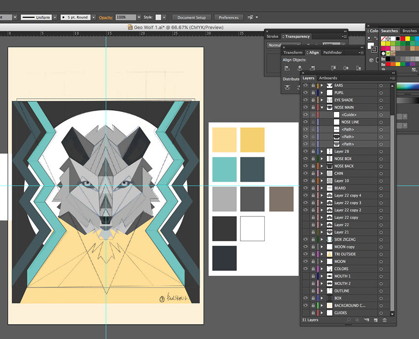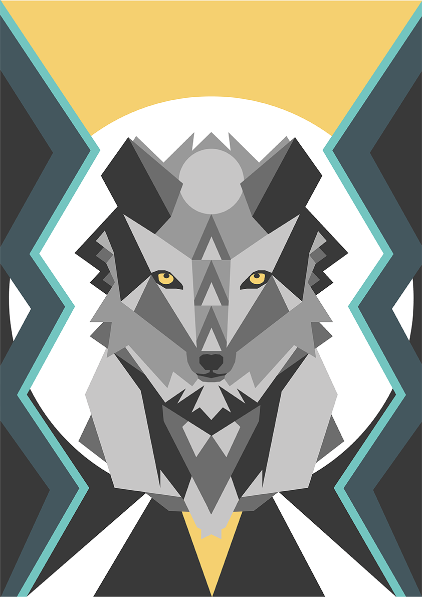 I took an online class DKNG Studios and below is the outcome. For this project, I choose to create a wolf as my geometric animal. The below images show the process of sketching, bring it into illustrator and creating an illustration using basic tools.