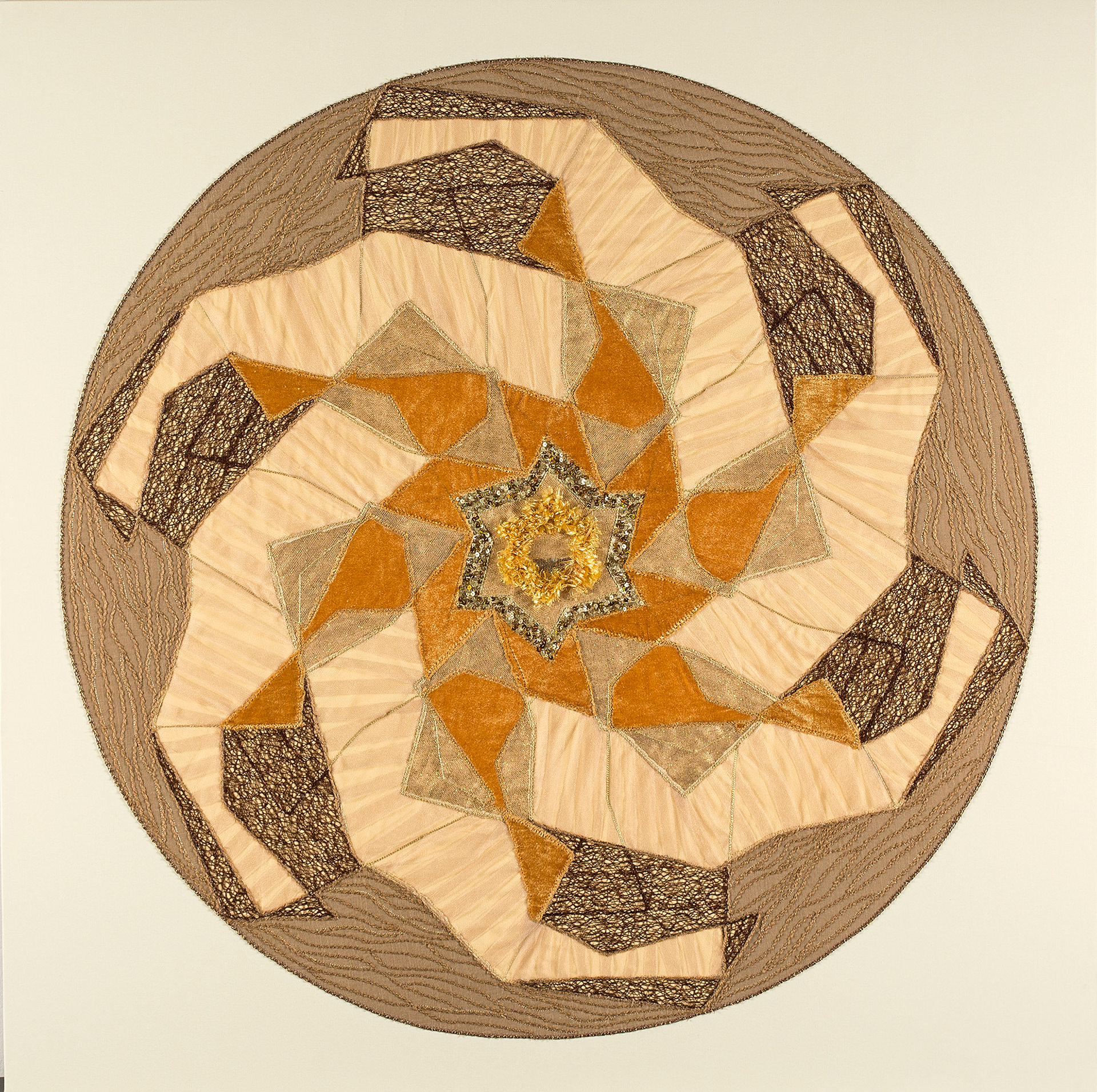 PALM BARK - screen-print, paint and embroidery on fabric, 86cm diameter, 2016