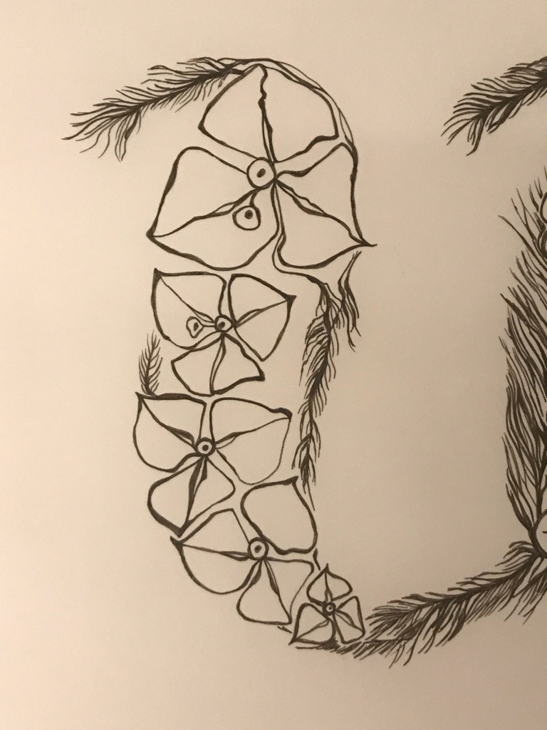 As mentioned in the project description I have included photos following Gemma's creative method. Typographic letterforms, sketches of the letters, images from gathered botanical elements from my surroundings, digital collage, final outcome.