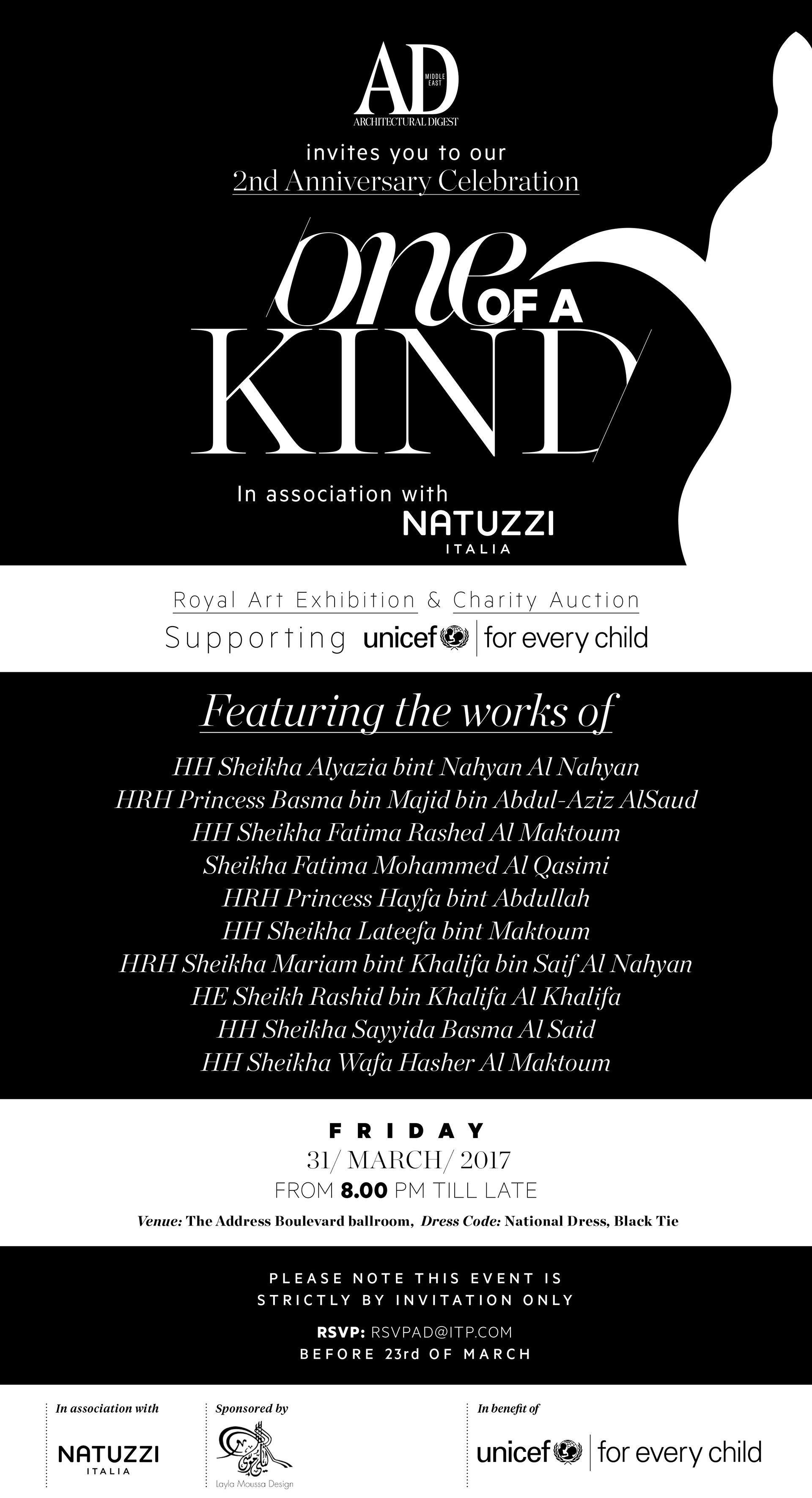 This is a special invitation as Architectural Digest Middle East is celebrating two years in the region and, to highlight the occasion, Architectural Digest are organizing a Royal charity event. This is the second time AD is hosting an event of this kind, allowing to extend the joy of our anniversary to the ones in need. With the 2016 edition of the AD One of a Kind exhibition supporting underprivileged children, UNICEF.